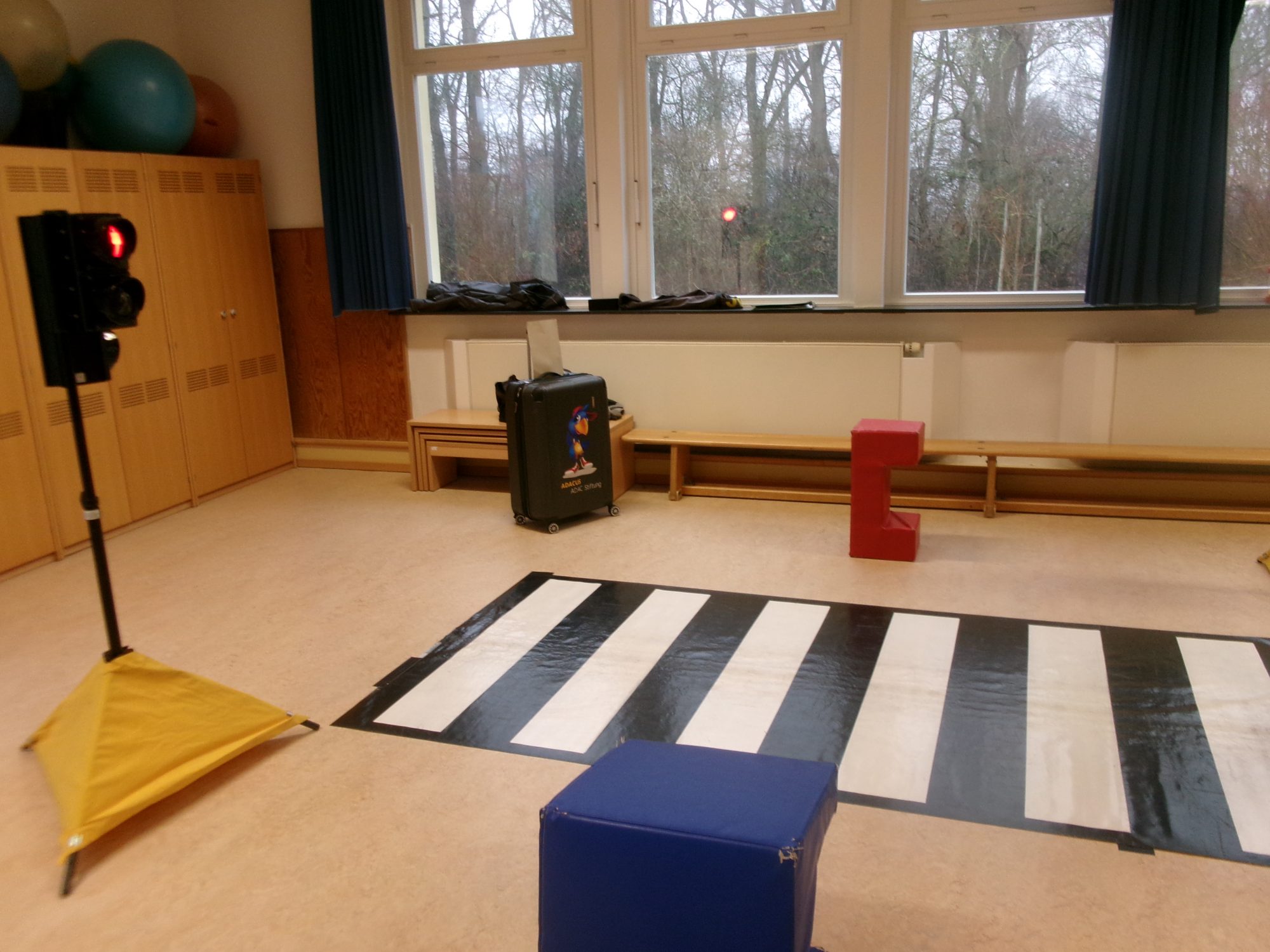 Mit viel Freude und Einfühlungsvermögen brachte der Rabe Adacus und der Mitarbeiter der ADAC Stiftung, den Kindern das wichtige Thema Verkehrssicherheit näher. Es wurde ein Zebrastreifen-Teppich ausgerollt und Ampeln aufgebaut, sodass typische Verkehrssituationen kindgerecht nachgestellt werden konnten.