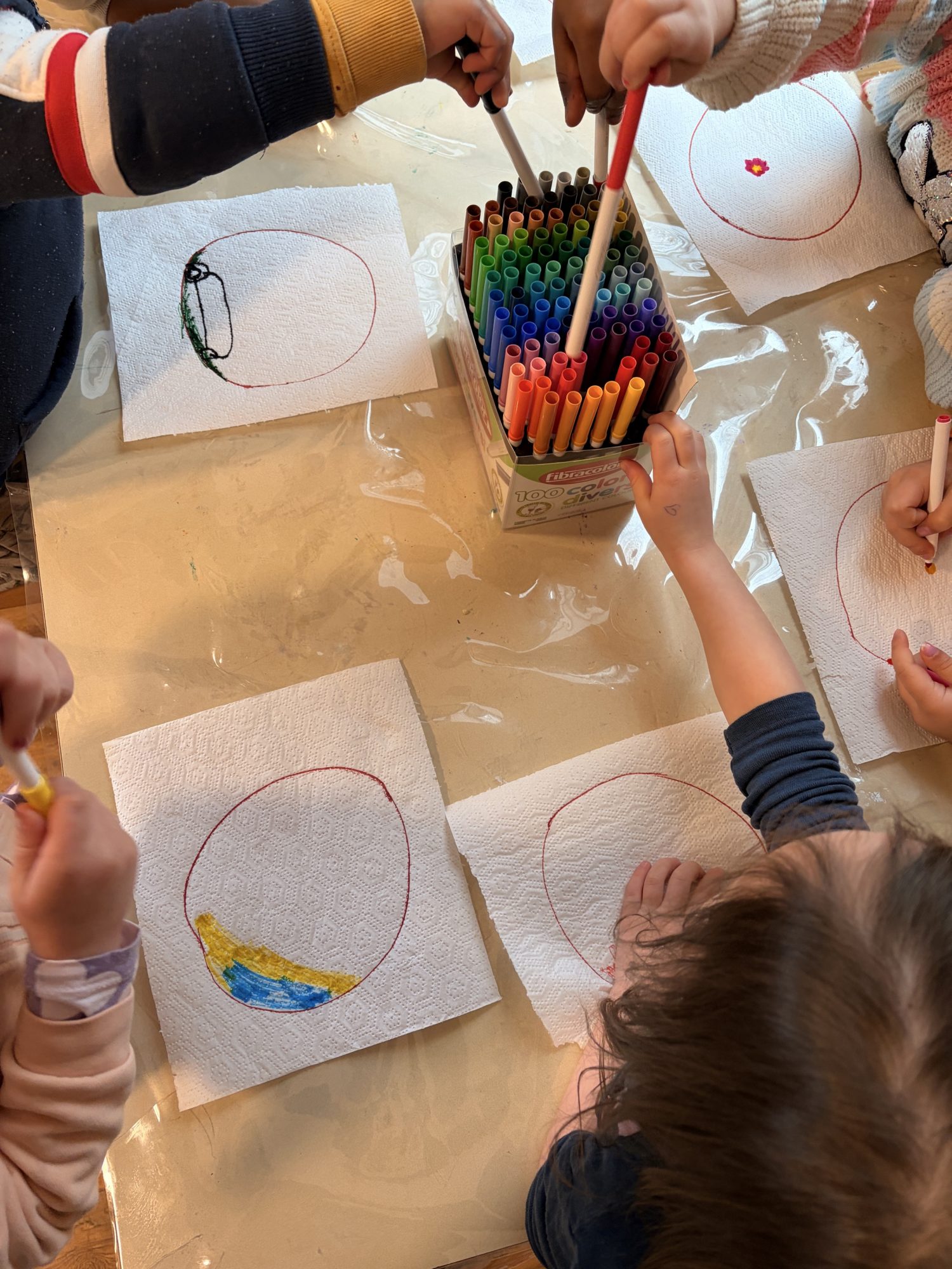 Am Donnerstag hatten die Kinder die Freiheit, einen bunten Regenbogen mit verschiedenen Materialien (Pappteller, Fingerfarbe, Krepppapier) zu gestalten.